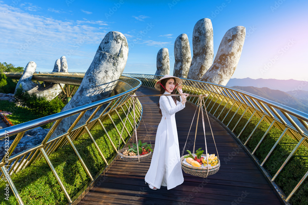 Young female tourists in Ao Dai dresses carry fruit baskets on a bridge.