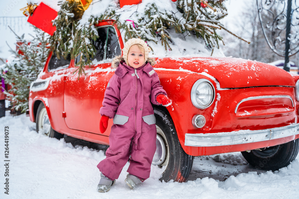 Cute little child girl with retro red car decorated for Christmas outdoor. A snowy winter day. One person.