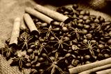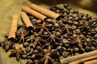 Coffee beans, cinnamon sticks and star anise