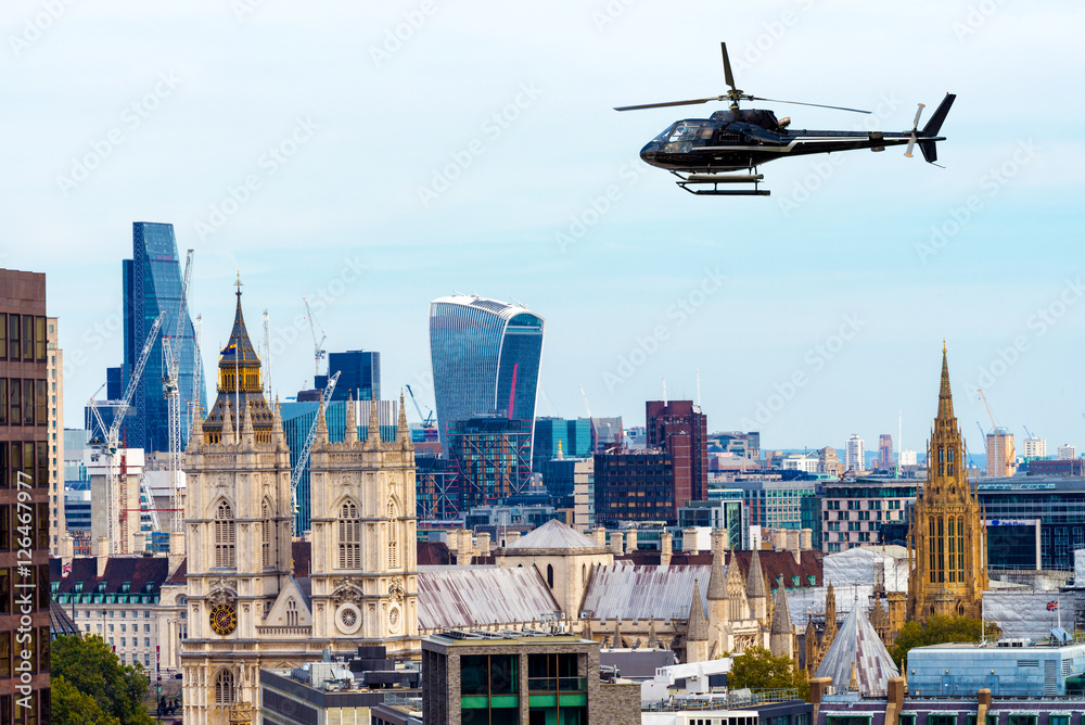 Helicopter over London skyline, old and new