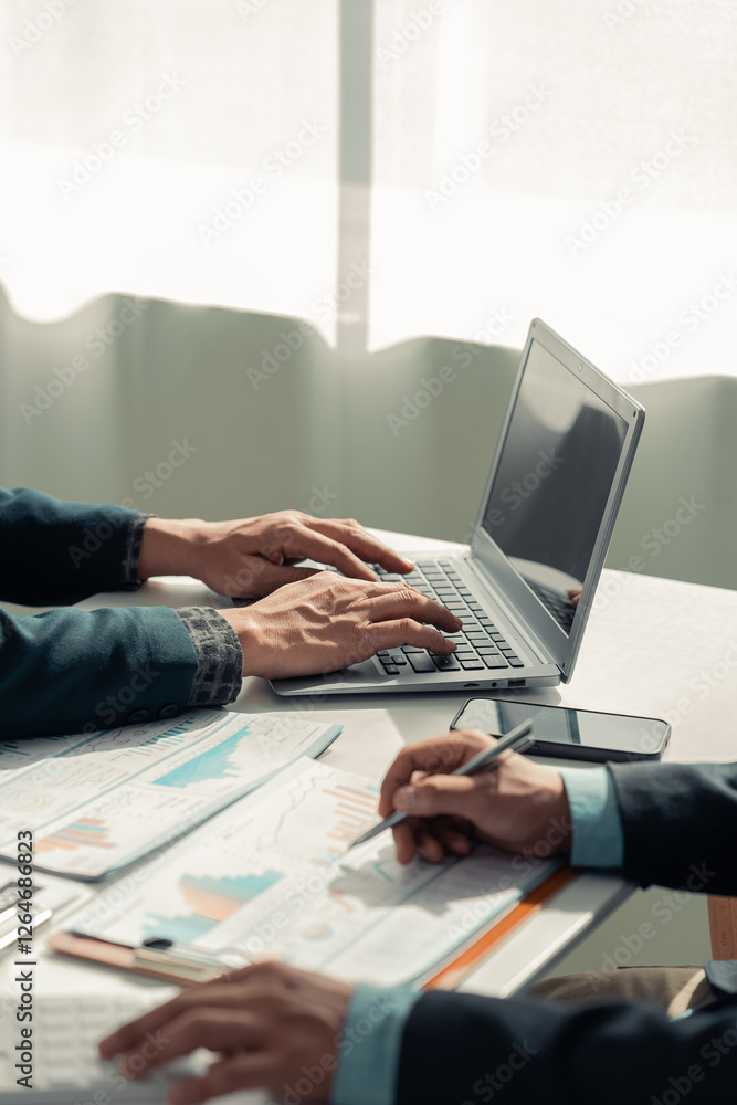 Business Colleagues team analyzes financial data at table in modern office about business strategy during discussion. There are financial charts and graphs on the table. Close-up vertical image