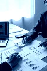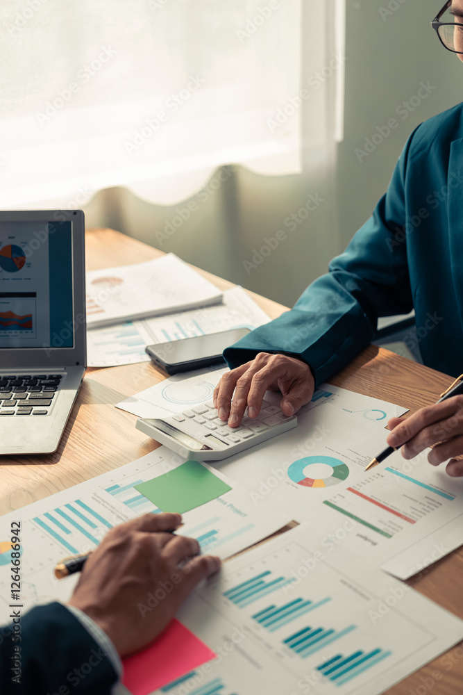 Business Colleagues team analyzes financial data at table in modern office about business strategy during discussion. There are financial charts and graphs on the table. Close-up vertical image