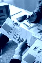 Business Colleagues team analyzes financial data at table in modern office about business strategy during discussion. There are financial charts and graphs on the table. Close-up vertical image