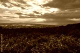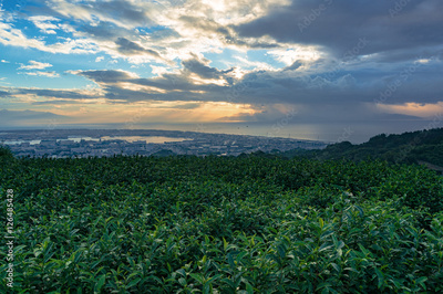 Close up of green tea leaves with sunrise landscape
