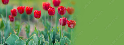 Beautiful red tulips on a flowering field in the springtime. Banner with copy space