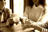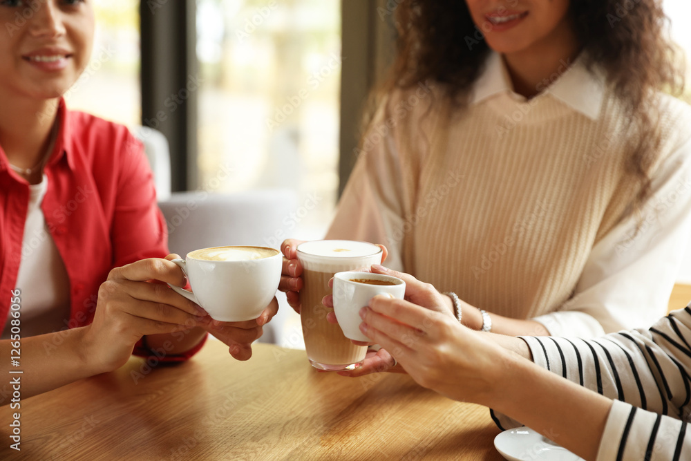 Women with cups of delicious coffee drinks at wooden table in cafe, closeup