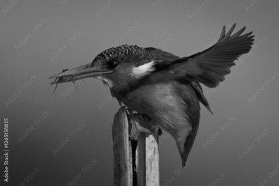 Mono malachite kingfisher on post fluttering wings