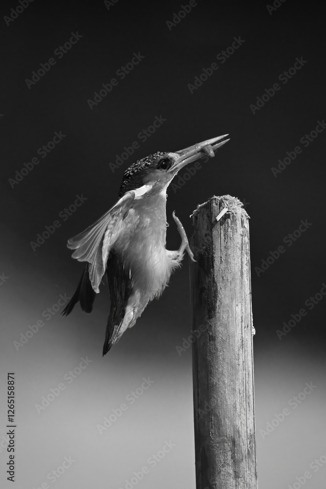 Mono malachite kingfisher on post holding bug