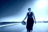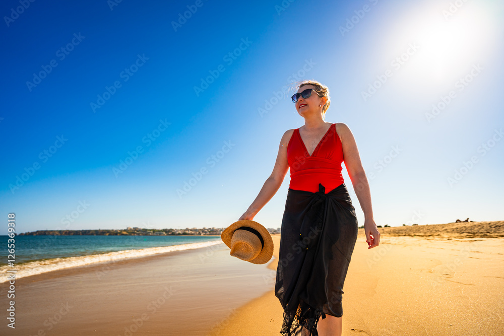 Beach vacations in Lagos, Portugal. Beautiful stylish middle-aged woman walking on sandy beach in summertime. Front view