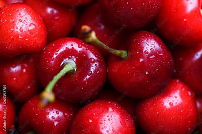 Juicy red cherries with water droplets close up. Macro food photography shot