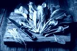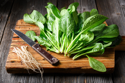 Green spinach leaves chopped with a vintage knife on a wooden board. Close-up culinary photography