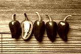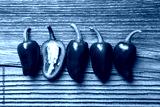 Green mexican jalapeno hot peppers placed in a row on wooden table close up. Food photography