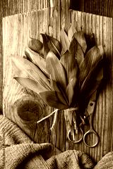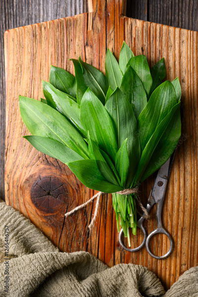 Bunch of vibrant green bear's garlic on a wooden cutting board. Macro food photography of fresh greens