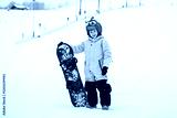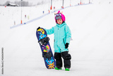 Smiling child in colorful snowboard gear standing on a snowy slope, holding a snowboard . Winter sports .