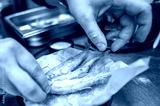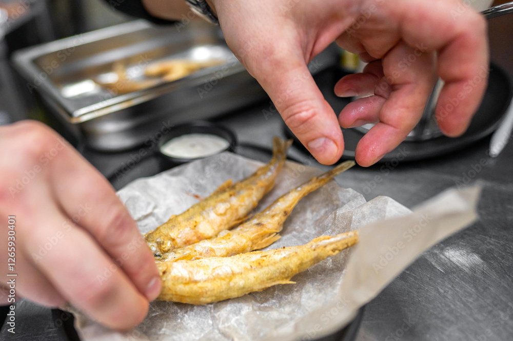 A chef's hands arrange freshly fried fish on a plate lined with parchment paper. The kitchen setting highlights a focus on culinary presentation and seafood dishes.