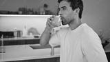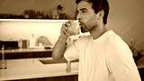 Man drinking green smoothie from glass in modern kitchen closeup. Smiling guy