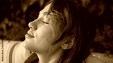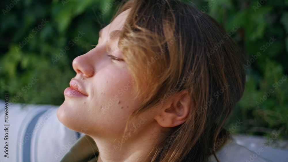 Beautiful woman enjoy relaxation moment closing eyes in green garden closeup.