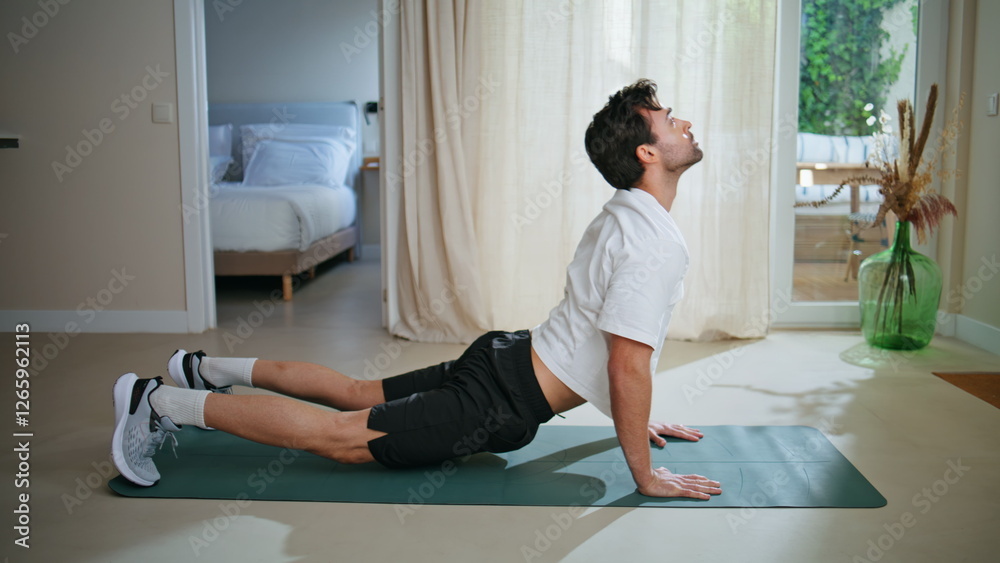 Handsome athlete stretching body practicing upward dog yoga pose on mat.