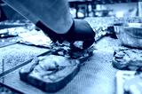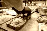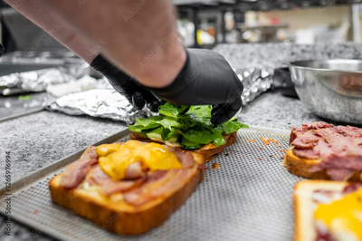 A close-up of a chef's hand in black gloves adding fresh spinach to a sandwich on a tray, showcasing layers of cheese and meat on toasted bread in a kitchen setting.