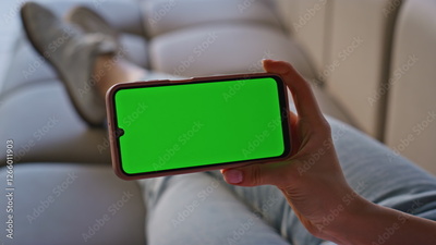 Woman finger tapping greenscreen resting couch closeup. Lady swiping chromakey