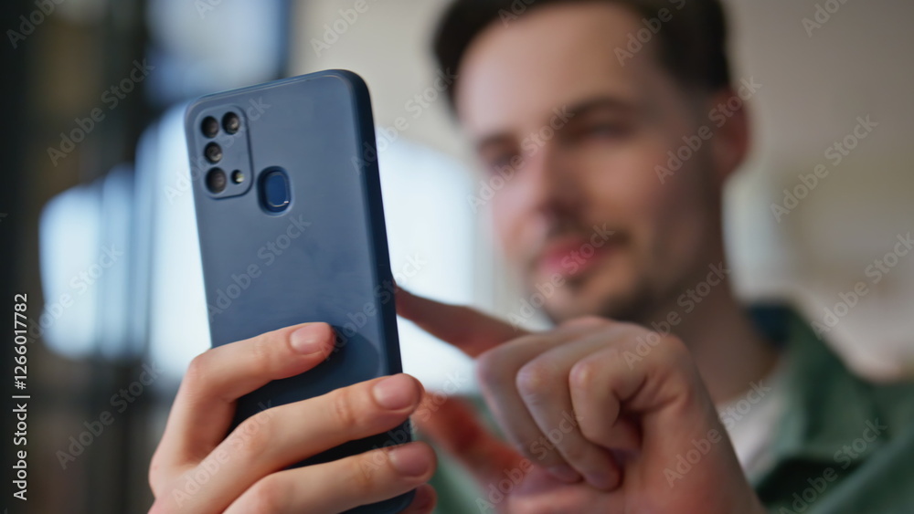 Cheerful student looking cellphone home closeup. Happy man watching smartphone