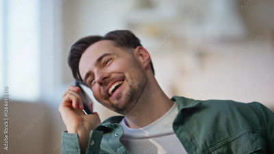 Emotional guy calling cellphone at home feeling relaxed closeup. Man chatting