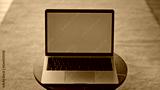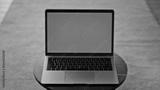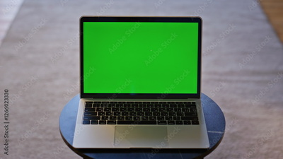 Modern chroma key laptop placed empty coffee table closeup. Green screen gadget