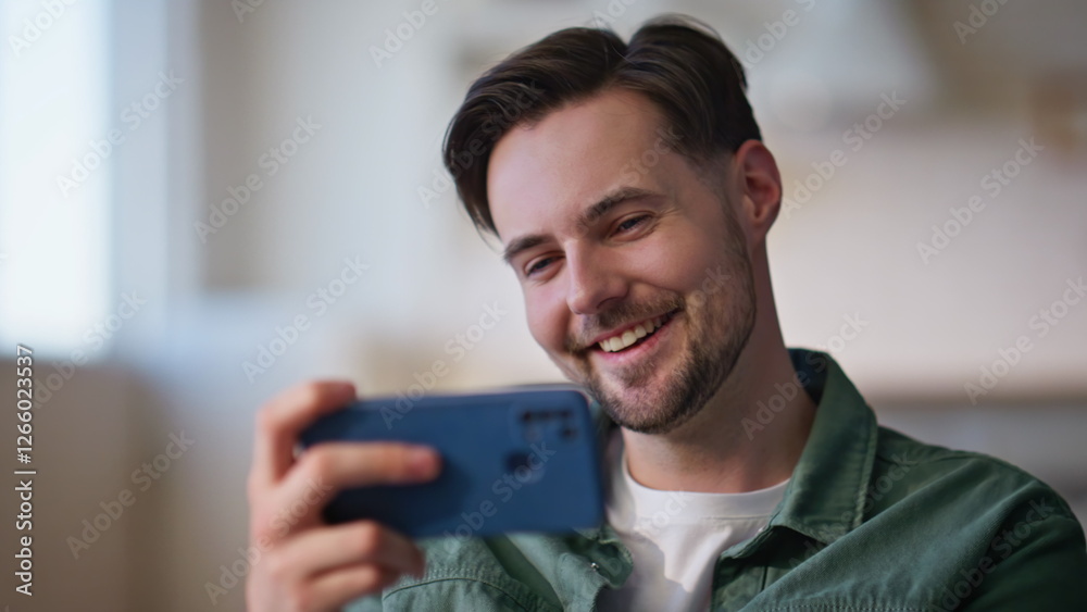 Cheerful brunette watching smartphone video at loft studio closeup. Resting guy