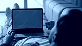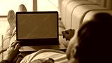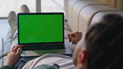 Freelancer using mockup laptop resting home sofa closeup. Man working computer