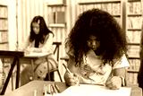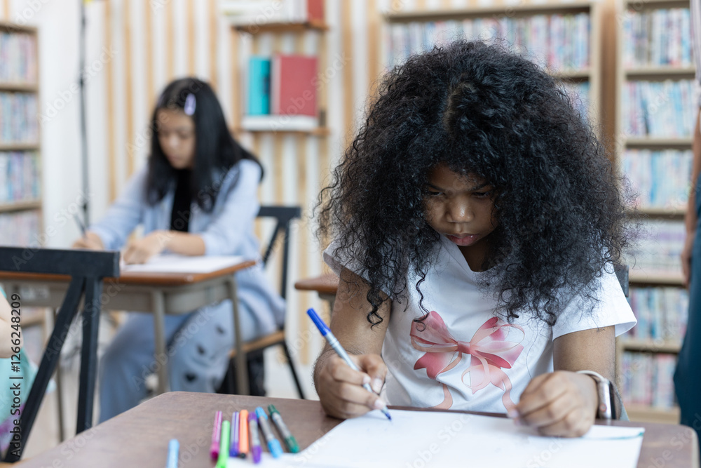 Bored school girl african american in classroom worried bullying depressed sadness.