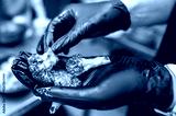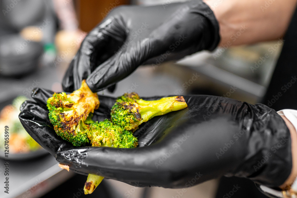 A chef in black gloves carefully inspects roasted broccoli. The vibrant green vegetables have a slightly charred appearance, highlighting their freshness and culinary preparation.