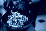 A close-up of a chef's hands assembling a vibrant dish in a black bowl. The meal features quinoa, grilled vegetables, and fresh greens, showcasing a blend of colors and textures.