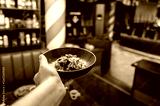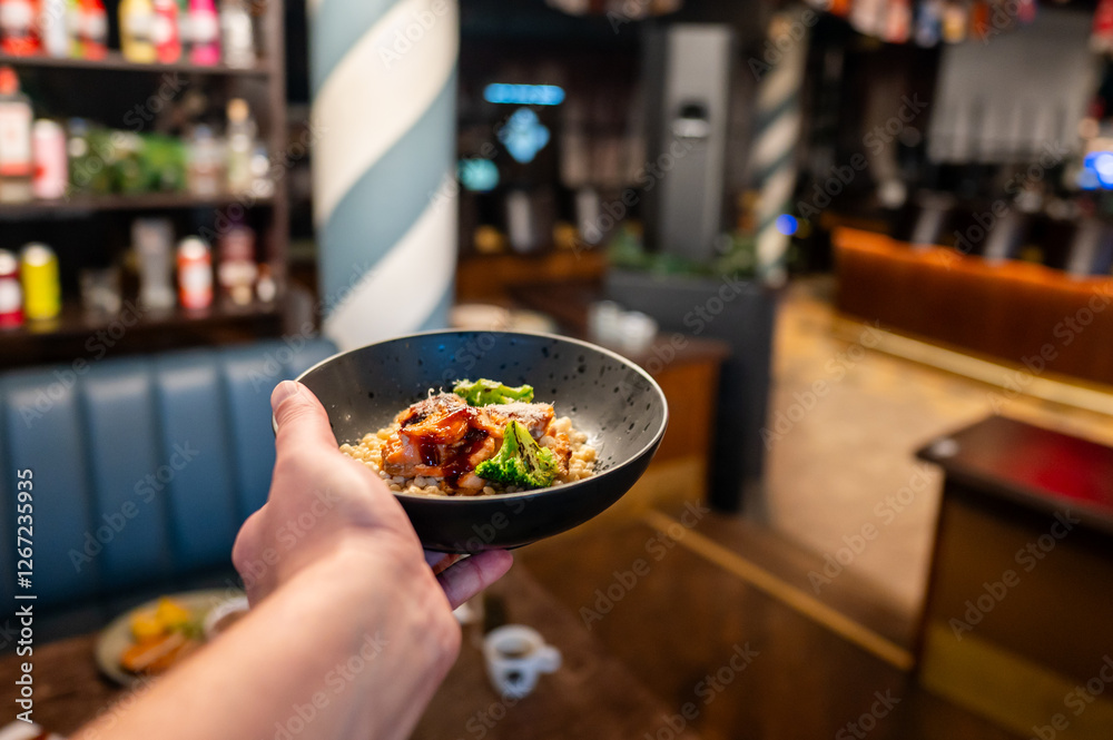 A hand holds a bowl of delicious food featuring colorful ingredients, set against a blurred restaurant interior. The scene captures a cozy dining atmosphere. Perfect for food-related themes.