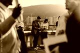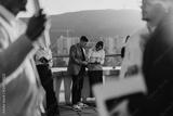 A group of business colleagues gather on a high tower balcony, brainstorming ideas and discussing innovative project solutions, highlighting teamwork and collaborative thinking.