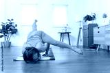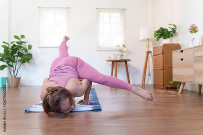 Senior Asian woman practicing Salabhasana Locust Pose on a yoga mat in a bright and peaceful home
