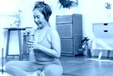 Senior Asian woman drinking smoothie after yoga session at home