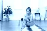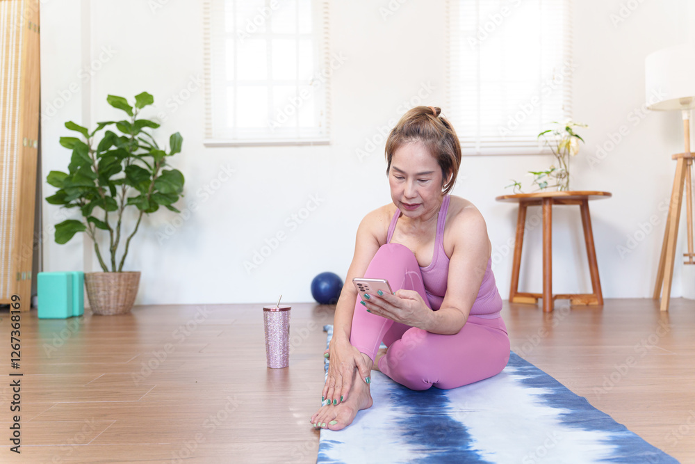 Senior Asian woman using smartphone while sitting on yoga mat