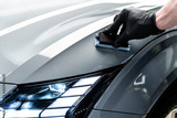 Car wash or detailing studio employee applies ceramic or graphene coating on gray paint for advanced protection and improved shine