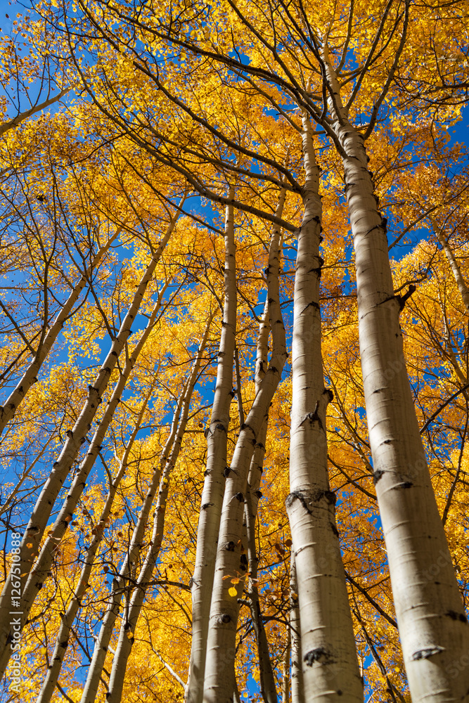 Yellow aspen trees in the autumn in Maroon Bells Aspen Colorado on a sunny autumn day