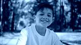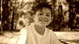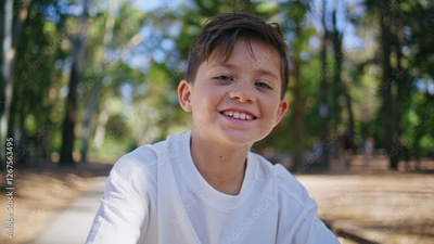 Cheerful kid looking camera at sunshine forest portrait. Happy child at park