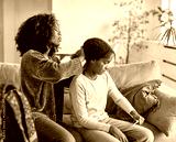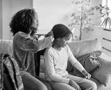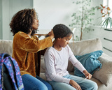 child mother family education school girl home daughter backpack help parent getting ready elementary teen morning hug love helping together black