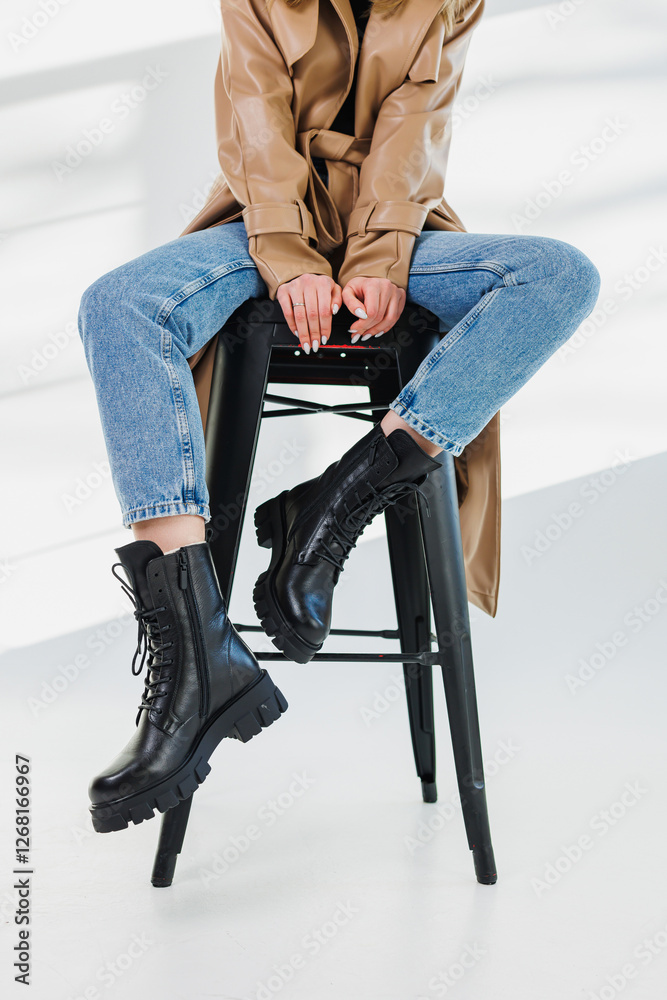 Female legs in jeans and black leather boots. Women's winter shoes