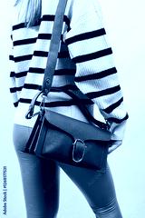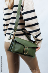 Small green leather bag in a female hand on a white background. Shoulder bag. A woman with a green handbag. Style, fashion, vintage and elegance.