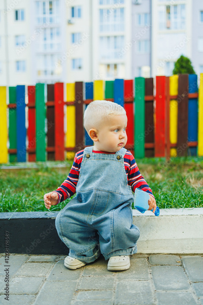 A cheerful toddler is playing joyfully outdoors in a vibrant, colorful, and lively setting
