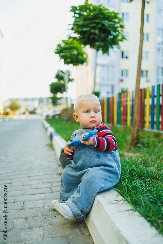 A Cute Toddler Engaging in Playful Activities Outdoors in a Vibrant City Environment, Enjoying Life