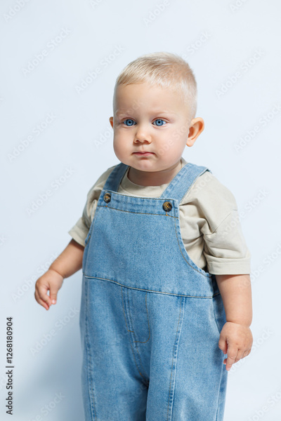 An adorable and cute child wearing stylish denim overalls, showcasing bright blue eyes