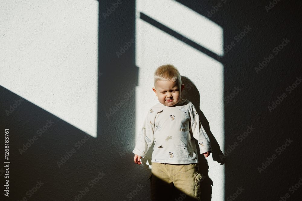 A Curious Child Enveloped in Shadowed Light, Embracing the World with Wonder and Joy