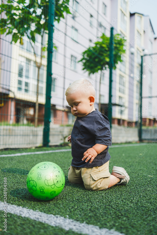 A toddler joyfully playing with a vibrant, colorful ball on a sunny grass field outdoors