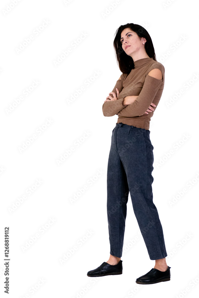 A woman with dark hair poses standing on a transparent background. She is wearing cropped pants and a brown sweater. She is standing sideways to the camera.