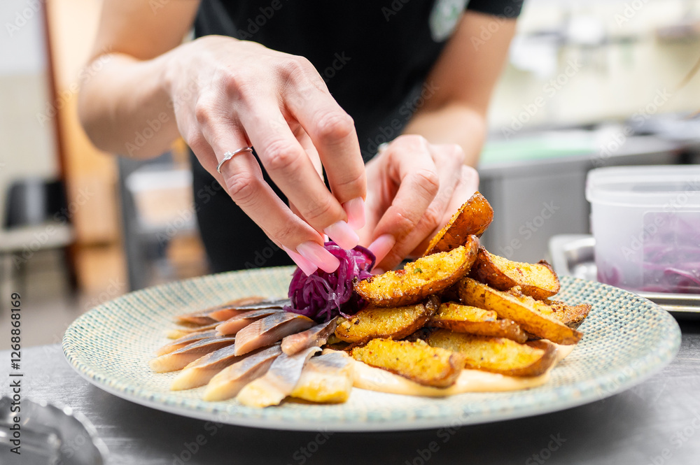 A close-up of a chef’s hand arranging vibrant purple garnish on a plate filled with crispy fried food and fish, showcasing culinary artistry in a modern kitchen setting.